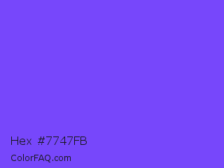 Hex #7747fb Color is a light indigo color and the nearest color is Very Light Blue #6666ff. Hex code #7747fb and RGB value is rgb(119,71,251). In RGB color space, this color is composed of 47% red, 28% green, 98% blue, In CMYK color space, this color is composed of 53% cyan, 72% magenta, 0% yellow , 2% black , In HSL color space, this color has a hue angle of 256° , 96% saturation and 63% lightness.