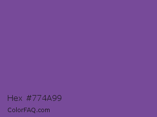 Hex #774a99 Color is a normal purple color and the nearest color is Dark Lavender #734f96. Hex code #774a99 and RGB value is rgb(119,74,153). In RGB color space, this color is composed of 47% red, 29% green, 60% blue, In CMYK color space, this color is composed of 22% cyan, 52% magenta, 0% yellow , 40% black , In HSL color space, this color has a hue angle of 274° , 35% saturation and 45% lightness.