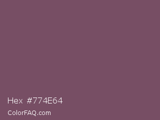 Hex #774e64 Color is a normal rose color and the nearest color is Russett #755a57. Hex code #774e64 and RGB value is rgb(119,78,100). In RGB color space, this color is composed of 47% red, 31% green, 39% blue, In CMYK color space, this color is composed of 0% cyan, 34% magenta, 16% yellow , 53% black , In HSL color space, this color has a hue angle of 328° , 21% saturation and 39% lightness.