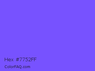 Hex #7752ff Color is a light indigo color and the nearest color is Very Light Blue #6666ff. Hex code #7752ff and RGB value is rgb(119,82,255). In RGB color space, this color is composed of 47% red, 32% green, 100% blue, In CMYK color space, this color is composed of 53% cyan, 68% magenta, 0% yellow , 0% black , In HSL color space, this color has a hue angle of 253° , 100% saturation and 66% lightness.