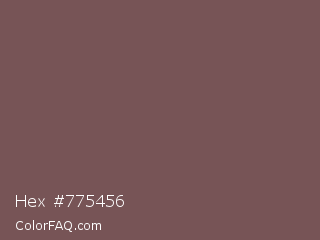 Hex #775456 Color is a normal red color and the nearest color is Russett #755a57. Hex code #775456 and RGB value is rgb(119,84,86). In RGB color space, this color is composed of 47% red, 33% green, 34% blue, In CMYK color space, this color is composed of 0% cyan, 29% magenta, 28% yellow , 53% black , In HSL color space, this color has a hue angle of 357° , 17% saturation and 40% lightness.