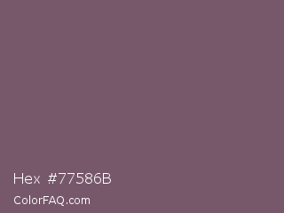 Hex #77586b Color is a normal magenta color and the nearest color is Falcon #7f626d. Hex code #77586b and RGB value is rgb(119,88,107). In RGB color space, this color is composed of 47% red, 35% green, 42% blue, In CMYK color space, this color is composed of 0% cyan, 26% magenta, 10% yellow , 53% black , In HSL color space, this color has a hue angle of 323° , 15% saturation and 41% lightness.