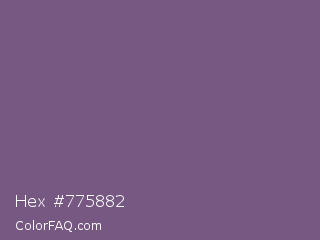 Hex #775882 Color is a normal purple color and the nearest color is Chinese Violet #856088. Hex code #775882 and RGB value is rgb(119,88,130). In RGB color space, this color is composed of 47% red, 35% green, 51% blue, In CMYK color space, this color is composed of 8% cyan, 32% magenta, 0% yellow , 49% black , In HSL color space, this color has a hue angle of 284° , 19% saturation and 43% lightness.