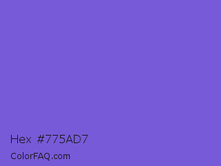 Hex #775ad7 Color is a normal indigo color and the nearest color is Slate Blue #6a5acd. Hex code #775ad7 and RGB value is rgb(119,90,215). In RGB color space, this color is composed of 47% red, 35% green, 84% blue, In CMYK color space, this color is composed of 45% cyan, 58% magenta, 0% yellow , 16% black , In HSL color space, this color has a hue angle of 254° , 61% saturation and 60% lightness.