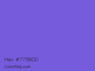 Hex #775bdd Color is a light indigo color and the nearest color is Slate Blue #6a5acd. Hex code #775bdd and RGB value is rgb(119,91,221). In RGB color space, this color is composed of 47% red, 36% green, 87% blue, In CMYK color space, this color is composed of 46% cyan, 59% magenta, 0% yellow , 13% black , In HSL color space, this color has a hue angle of 253° , 66% saturation and 61% lightness.
