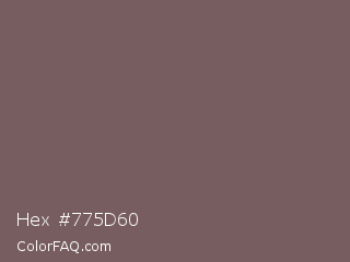 Hex #775d60 Color is a normal red color and the nearest color is Deep Taupe #7e5e60. Hex code #775d60 and RGB value is rgb(119,93,96). In RGB color space, this color is composed of 47% red, 36% green, 38% blue, In CMYK color space, this color is composed of 0% cyan, 22% magenta, 19% yellow , 53% black , In HSL color space, this color has a hue angle of 353° , 12% saturation and 42% lightness.