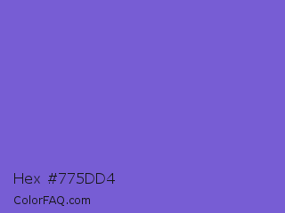 Hex #775dd4 Color is a normal indigo color and the nearest color is Slate Blue #6a5acd. Hex code #775dd4 and RGB value is rgb(119,93,212). In RGB color space, this color is composed of 47% red, 36% green, 83% blue, In CMYK color space, this color is composed of 44% cyan, 56% magenta, 0% yellow , 17% black , In HSL color space, this color has a hue angle of 253° , 58% saturation and 60% lightness.