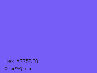Hex #775df8 Color is a light indigo color and the nearest color is Medium Slate Blue #7b68ee. Hex code #775df8 and RGB value is rgb(119,93,248). In RGB color space, this color is composed of 47% red, 36% green, 97% blue, In CMYK color space, this color is composed of 52% cyan, 63% magenta, 0% yellow , 3% black , In HSL color space, this color has a hue angle of 250° , 92% saturation and 67% lightness.
