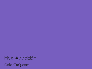 Hex #775ebf Color is a normal indigo color and the nearest color is Fuchsia Blue #7a58c1. Hex code #775ebf and RGB value is rgb(119,94,191). In RGB color space, this color is composed of 47% red, 37% green, 75% blue, In CMYK color space, this color is composed of 38% cyan, 51% magenta, 0% yellow , 25% black , In HSL color space, this color has a hue angle of 255° , 43% saturation and 56% lightness.