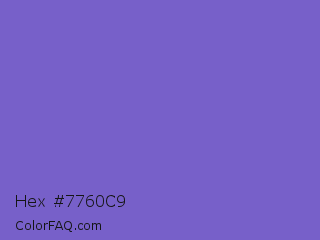Hex #7760c9 Color is a normal indigo color and the nearest color is Blue Marguerite #7666c6. Hex code #7760c9 and RGB value is rgb(119,96,201). In RGB color space, this color is composed of 47% red, 38% green, 79% blue, In CMYK color space, this color is composed of 41% cyan, 52% magenta, 0% yellow , 21% black , In HSL color space, this color has a hue angle of 253° , 49% saturation and 58% lightness.