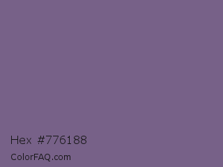 Hex #776188 Color is a normal purple color and the nearest color is Rum #796989. Hex code #776188 and RGB value is rgb(119,97,136). In RGB color space, this color is composed of 47% red, 38% green, 53% blue, In CMYK color space, this color is composed of 13% cyan, 29% magenta, 0% yellow , 47% black , In HSL color space, this color has a hue angle of 274° , 17% saturation and 46% lightness.
