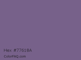 Hex #77618a Color is a normal purple color and the nearest color is Rum #796989. Hex code #77618a and RGB value is rgb(119,97,138). In RGB color space, this color is composed of 47% red, 38% green, 54% blue, In CMYK color space, this color is composed of 14% cyan, 30% magenta, 0% yellow , 46% black , In HSL color space, this color has a hue angle of 272° , 17% saturation and 46% lightness.