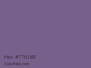 Hex #77618b Color is a normal purple color and the nearest color is Rum #796989. Hex code #77618b and RGB value is rgb(119,97,139). In RGB color space, this color is composed of 47% red, 38% green, 55% blue, In CMYK color space, this color is composed of 14% cyan, 30% magenta, 0% yellow , 45% black , In HSL color space, this color has a hue angle of 271° , 18% saturation and 46% lightness.