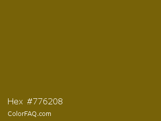 Hex #776208 Color is a dark yellow color and the nearest color is Yukon Gold #7b6608. Hex code #776208 and RGB value is rgb(119,98,8). In RGB color space, this color is composed of 47% red, 38% green, 3% blue, In CMYK color space, this color is composed of 0% cyan, 18% magenta, 93% yellow , 53% black , In HSL color space, this color has a hue angle of 49° , 87% saturation and 25% lightness.