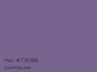 Hex #77638b Color is a normal violet color and the nearest color is Rum #796989. Hex code #77638b and RGB value is rgb(119,99,139). In RGB color space, this color is composed of 47% red, 39% green, 55% blue, In CMYK color space, this color is composed of 14% cyan, 29% magenta, 0% yellow , 45% black , In HSL color space, this color has a hue angle of 270° , 17% saturation and 47% lightness.