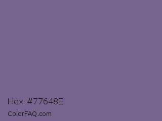 Hex #77648e Color is a normal violet color and the nearest color is Rum #796989. Hex code #77648e and RGB value is rgb(119,100,142). In RGB color space, this color is composed of 47% red, 39% green, 56% blue, In CMYK color space, this color is composed of 16% cyan, 30% magenta, 0% yellow , 44% black , In HSL color space, this color has a hue angle of 267° , 17% saturation and 47% lightness.