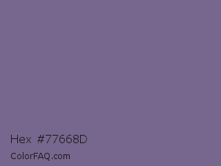 Hex #77668d Color is a normal violet color and the nearest color is Rum #796989. Hex code #77668d and RGB value is rgb(119,102,141). In RGB color space, this color is composed of 47% red, 40% green, 55% blue, In CMYK color space, this color is composed of 16% cyan, 28% magenta, 0% yellow , 45% black , In HSL color space, this color has a hue angle of 266° , 16% saturation and 48% lightness.