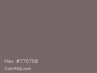Hex #776768 Color is a normal red color and the nearest color is Sandstone #796d62. Hex code #776768 and RGB value is rgb(119,103,104). In RGB color space, this color is composed of 47% red, 40% green, 41% blue, In CMYK color space, this color is composed of 0% cyan, 13% magenta, 13% yellow , 53% black , In HSL color space, this color has a hue angle of 356° , 7% saturation and 44% lightness.