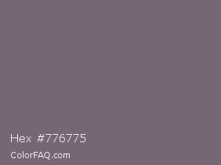 Hex #776775 Color is a normal magenta color and the nearest color is Old Lavender #796878. Hex code #776775 and RGB value is rgb(119,103,117). In RGB color space, this color is composed of 47% red, 40% green, 46% blue, In CMYK color space, this color is composed of 0% cyan, 13% magenta, 2% yellow , 53% black , In HSL color space, this color has a hue angle of 308° , 7% saturation and 44% lightness.