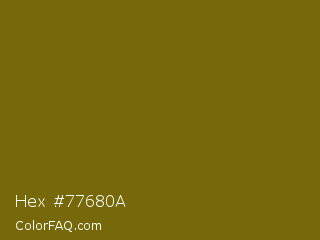 Hex #77680a Color is a dark yellow color and the nearest color is Yukon Gold #7b6608. Hex code #77680a and RGB value is rgb(119,104,10). In RGB color space, this color is composed of 47% red, 41% green, 4% blue, In CMYK color space, this color is composed of 0% cyan, 13% magenta, 92% yellow , 53% black , In HSL color space, this color has a hue angle of 52° , 84% saturation and 25% lightness.