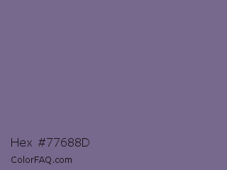 Hex #77688d Color is a normal violet color and the nearest color is Rum #796989. Hex code #77688d and RGB value is rgb(119,104,141). In RGB color space, this color is composed of 47% red, 41% green, 55% blue, In CMYK color space, this color is composed of 16% cyan, 26% magenta, 0% yellow , 45% black , In HSL color space, this color has a hue angle of 264° , 15% saturation and 48% lightness.