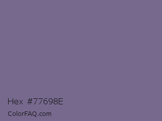 Hex #77698e Color is a normal violet color and the nearest color is Rum #796989. Hex code #77698e and RGB value is rgb(119,105,142). In RGB color space, this color is composed of 47% red, 41% green, 56% blue, In CMYK color space, this color is composed of 16% cyan, 26% magenta, 0% yellow , 44% black , In HSL color space, this color has a hue angle of 263° , 15% saturation and 48% lightness.