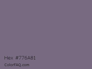 Hex #776a81 Color is a normal purple color and the nearest color is Rum #796989. Hex code #776a81 and RGB value is rgb(119,106,129). In RGB color space, this color is composed of 47% red, 42% green, 51% blue, In CMYK color space, this color is composed of 8% cyan, 18% magenta, 0% yellow , 49% black , In HSL color space, this color has a hue angle of 274° , 10% saturation and 46% lightness.