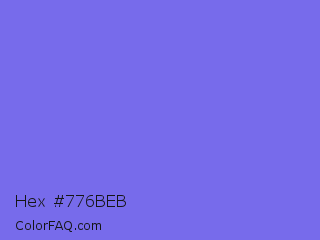 Hex #776beb Color is a light indigo color and the nearest color is Medium Slate Blue #7b68ee. Hex code #776beb and RGB value is rgb(119,107,235). In RGB color space, this color is composed of 47% red, 42% green, 92% blue, In CMYK color space, this color is composed of 49% cyan, 54% magenta, 0% yellow , 8% black , In HSL color space, this color has a hue angle of 246° , 76% saturation and 67% lightness.