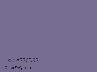 Hex #776d92 Color is a normal indigo color and the nearest color is Rhythm #777696. Hex code #776d92 and RGB value is rgb(119,109,146). In RGB color space, this color is composed of 47% red, 43% green, 57% blue, In CMYK color space, this color is composed of 18% cyan, 25% magenta, 0% yellow , 43% black , In HSL color space, this color has a hue angle of 256° , 15% saturation and 50% lightness.