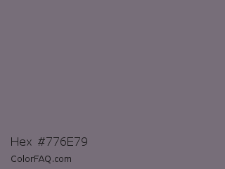Hex #776e79 Color is a normal purple color and the nearest color is Fedora #796a78. Hex code #776e79 and RGB value is rgb(119,110,121). In RGB color space, this color is composed of 47% red, 43% green, 47% blue, In CMYK color space, this color is composed of 2% cyan, 9% magenta, 0% yellow , 53% black , In HSL color space, this color has a hue angle of 289° , 5% saturation and 45% lightness.