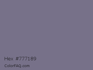 Hex #777189 Color is a normal indigo color and the nearest color is Storm Gray #717486. Hex code #777189 and RGB value is rgb(119,113,137). In RGB color space, this color is composed of 47% red, 44% green, 54% blue, In CMYK color space, this color is composed of 13% cyan, 18% magenta, 0% yellow , 46% black , In HSL color space, this color has a hue angle of 255° , 10% saturation and 49% lightness.