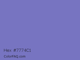 Hex #7774c1 Color is a light indigo color and the nearest color is Toolbox #746cc0. Hex code #7774c1 and RGB value is rgb(119,116,193). In RGB color space, this color is composed of 47% red, 45% green, 76% blue, In CMYK color space, this color is composed of 38% cyan, 40% magenta, 0% yellow , 24% black , In HSL color space, this color has a hue angle of 242° , 38% saturation and 61% lightness.