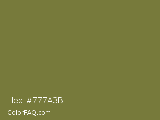 Hex #777a3b Color is a normal yellow color and the nearest color is Pesto #7c7631. Hex code #777a3b and RGB value is rgb(119,122,59). In RGB color space, this color is composed of 47% red, 48% green, 23% blue, In CMYK color space, this color is composed of 2% cyan, 0% magenta, 52% yellow , 52% black , In HSL color space, this color has a hue angle of 63° , 35% saturation and 35% lightness.
