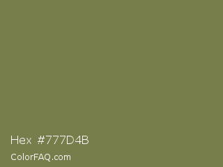 Hex #777d4b Color is a normal yellow color and the nearest color is Gold Fusion #85754e. Hex code #777d4b and RGB value is rgb(119,125,75). In RGB color space, this color is composed of 47% red, 49% green, 29% blue, In CMYK color space, this color is composed of 5% cyan, 0% magenta, 40% yellow , 51% black , In HSL color space, this color has a hue angle of 67° , 25% saturation and 39% lightness.