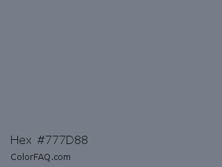 Hex #777d88 Color is a normal blue color and the nearest color is Raven #727b89. Hex code #777d88 and RGB value is rgb(119,125,136). In RGB color space, this color is composed of 47% red, 49% green, 53% blue, In CMYK color space, this color is composed of 13% cyan, 8% magenta, 0% yellow , 47% black , In HSL color space, this color has a hue angle of 219° , 7% saturation and 50% lightness.