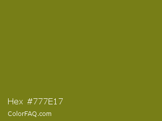 Hex #777e17 Color is a dark yellow color and the nearest color is Pacifika #778120. Hex code #777e17 and RGB value is rgb(119,126,23). In RGB color space, this color is composed of 47% red, 49% green, 9% blue, In CMYK color space, this color is composed of 6% cyan, 0% magenta, 82% yellow , 51% black , In HSL color space, this color has a hue angle of 64° , 69% saturation and 29% lightness.
