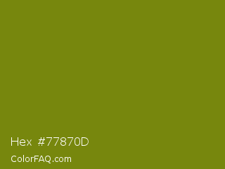 Hex #77870d Color is a dark yellow color and the nearest color is Trendy Green #7c881a. Hex code #77870d and RGB value is rgb(119,135,13). In RGB color space, this color is composed of 47% red, 53% green, 5% blue, In CMYK color space, this color is composed of 12% cyan, 0% magenta, 90% yellow , 47% black , In HSL color space, this color has a hue angle of 68° , 82% saturation and 29% lightness.