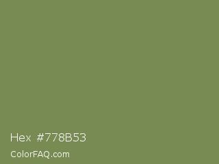 Hex #778b53 Color is a normal green color and the nearest color is Highland #6f8e63. Hex code #778b53 and RGB value is rgb(119,139,83). In RGB color space, this color is composed of 47% red, 55% green, 33% blue, In CMYK color space, this color is composed of 14% cyan, 0% magenta, 40% yellow , 45% black , In HSL color space, this color has a hue angle of 81° , 25% saturation and 44% lightness.