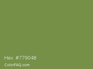 Hex #779048 Color is a normal green color and the nearest color is Palm Leaf #6f9940. Hex code #779048 and RGB value is rgb(119,144,72). In RGB color space, this color is composed of 47% red, 56% green, 28% blue, In CMYK color space, this color is composed of 17% cyan, 0% magenta, 50% yellow , 44% black , In HSL color space, this color has a hue angle of 81° , 33% saturation and 42% lightness.