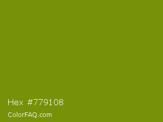 Hex #779108 Color is a dark lime color and the nearest color is Limeade #6f9d02. Hex code #779108 and RGB value is rgb(119,145,8). In RGB color space, this color is composed of 47% red, 57% green, 3% blue, In CMYK color space, this color is composed of 18% cyan, 0% magenta, 94% yellow , 43% black , In HSL color space, this color has a hue angle of 71° , 90% saturation and 30% lightness.