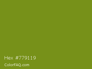 Hex #779119 Color is a normal lime color and the nearest color is Trendy Green #7c881a. Hex code #779119 and RGB value is rgb(119,145,25). In RGB color space, this color is composed of 47% red, 57% green, 10% blue, In CMYK color space, this color is composed of 18% cyan, 0% magenta, 83% yellow , 43% black , In HSL color space, this color has a hue angle of 73° , 71% saturation and 33% lightness.