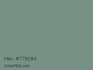 Hex #779184 Color is a normal green color and the nearest color is Blue Smoke #748881. Hex code #779184 and RGB value is rgb(119,145,132). In RGB color space, this color is composed of 47% red, 57% green, 52% blue, In CMYK color space, this color is composed of 18% cyan, 0% magenta, 9% yellow , 43% black , In HSL color space, this color has a hue angle of 150° , 11% saturation and 52% lightness.