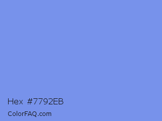 Hex #7792eb Color is a light blue color and the nearest color is Cornflower Blue #6495ed. Hex code #7792eb and RGB value is rgb(119,146,235). In RGB color space, this color is composed of 47% red, 57% green, 92% blue, In CMYK color space, this color is composed of 49% cyan, 38% magenta, 0% yellow , 8% black , In HSL color space, this color has a hue angle of 226° , 74% saturation and 69% lightness.