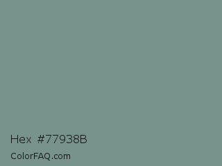 Hex #77938b Color is a normal green color and the nearest color is Oxley #779e86. Hex code #77938b and RGB value is rgb(119,147,139). In RGB color space, this color is composed of 47% red, 58% green, 55% blue, In CMYK color space, this color is composed of 19% cyan, 0% magenta, 5% yellow , 42% black , In HSL color space, this color has a hue angle of 163° , 11% saturation and 52% lightness.