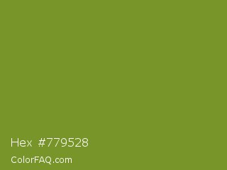 Hex #779528 Color is a normal lime color and the nearest color is Wasabi #788a25. Hex code #779528 and RGB value is rgb(119,149,40). In RGB color space, this color is composed of 47% red, 58% green, 16% blue, In CMYK color space, this color is composed of 20% cyan, 0% magenta, 73% yellow , 42% black , In HSL color space, this color has a hue angle of 77° , 58% saturation and 37% lightness.