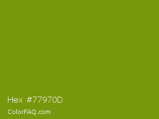Hex #77970d Color is a normal lime color and the nearest color is Limeade #6f9d02. Hex code #77970d and RGB value is rgb(119,151,13). In RGB color space, this color is composed of 47% red, 59% green, 5% blue, In CMYK color space, this color is composed of 21% cyan, 0% magenta, 91% yellow , 41% black , In HSL color space, this color has a hue angle of 74° , 84% saturation and 32% lightness.