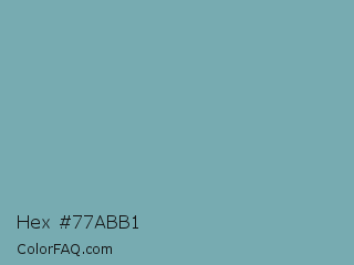 Hex #77abb1 Color is a normal cyan color and the nearest color is Gulf Stream #80b3ae. Hex code #77abb1 and RGB value is rgb(119,171,177). In RGB color space, this color is composed of 47% red, 67% green, 69% blue, In CMYK color space, this color is composed of 33% cyan, 3% magenta, 0% yellow , 31% black , In HSL color space, this color has a hue angle of 186° , 27% saturation and 58% lightness.