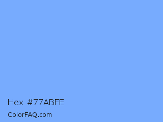 Hex #77abfe Color is a light blue color and the nearest color is French Sky Blue #77b5fe. Hex code #77abfe and RGB value is rgb(119,171,254). In RGB color space, this color is composed of 47% red, 67% green, 100% blue, In CMYK color space, this color is composed of 53% cyan, 33% magenta, 0% yellow , 0% black , In HSL color space, this color has a hue angle of 217° , 99% saturation and 73% lightness.