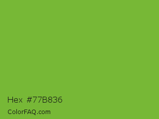 Hex #77b836 Color is a normal green color and the nearest color is Green RYB #66b032. Hex code #77b836 and RGB value is rgb(119,184,54). In RGB color space, this color is composed of 47% red, 72% green, 21% blue, In CMYK color space, this color is composed of 35% cyan, 0% magenta, 71% yellow , 28% black , In HSL color space, this color has a hue angle of 90° , 55% saturation and 47% lightness.