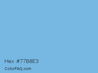 Hex #77b8e3 Color is a light blue color and the nearest color is Aero #7cb9e8. Hex code #77b8e3 and RGB value is rgb(119,184,227). In RGB color space, this color is composed of 47% red, 72% green, 89% blue, In CMYK color space, this color is composed of 48% cyan, 19% magenta, 0% yellow , 11% black , In HSL color space, this color has a hue angle of 204° , 66% saturation and 68% lightness.